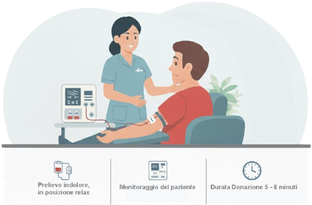 Il donatore è sdraiato in posizione confortevole e collegato a sistemi di raccolta sterili e monouso.